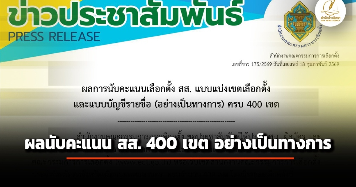 สำนักข่าวอิศรา (www.isranews.org) รายงานว่า วันที่ 18 กุมภาพันธ์ 2569 สำนักงานคณะกรรมการการเลือกตั้ง (กกต.) เผยแพร่ข่าวประชาสัมพันธ์ (PRESS RELEASE) เลขที่ข่าว 175/2569 เรื่อง ผลการนับคะแนนเลือกตั้ง สส. แบบแบ่งเขตเลือกตั้งและแบบบัญชีรายชื่อ (อย่างเป็นทางการ) ครบ 400 เขต