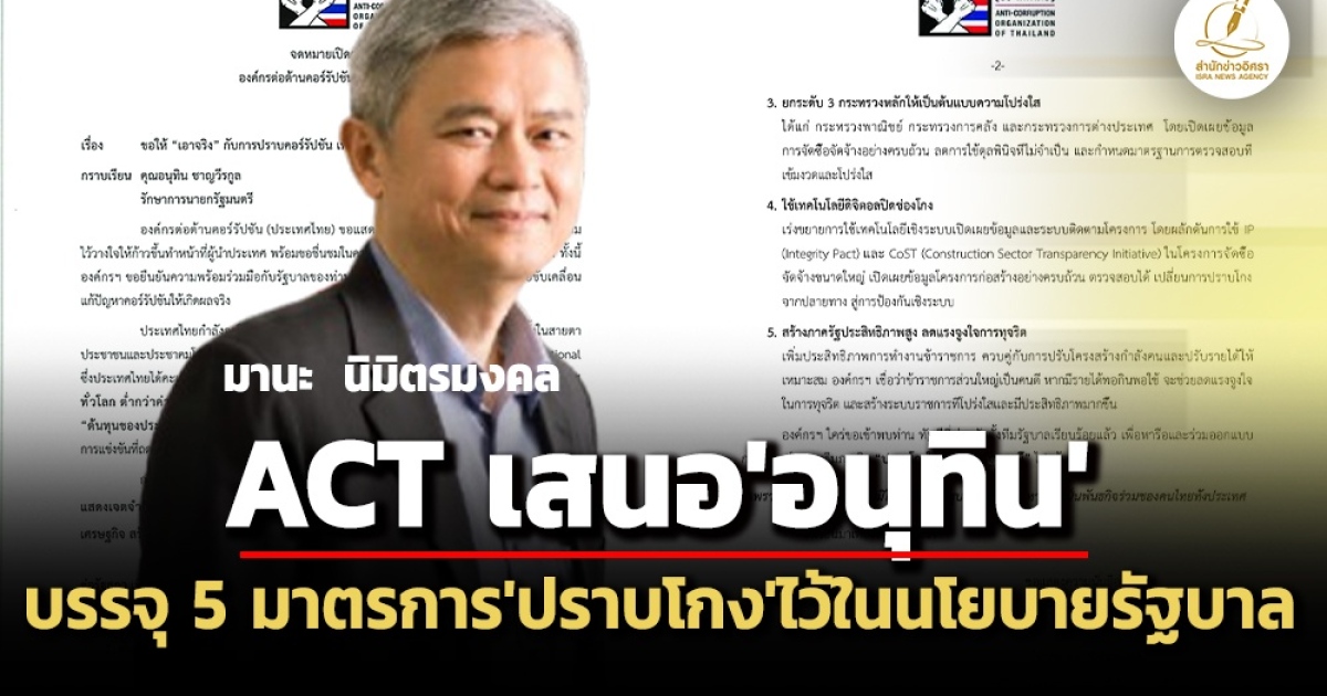 เมื่อวันที่ 19 ก.พ. องค์กรต่อต้านคอร์รัปชัน (ประเทศไทย) หรือ ACT ได้ออกจดหมายเปิดผนึก เรื่อง ขอให้ “เอาจริง” กับการปราบคอร์รัปชัน เพื่ออนาคตประเทศไทย ถึงนายอนุทิน ชาญวีรกูล รักษาการนายกรัฐมนตรี โดยมีเนื้อหาว่า องค์กรต่อต้านคอร์รัปชัน (ประเทศไทย) ขอแสดงความยินดีต่อท่าน ในโอกาสที่ได้รับความไว้วางใจให้ก้าวขึ้นทำหน้าที่ผู้นำประเทศ พร้อมขอชื่นชมในความตั้งใจ “ปราบคอร์รัปชัน”อย่างจริงจัง ทั้งนี้ องค์กรฯ ขอยืนยันความพร้อมร่วมมือกับรัฐบาลของท่านอย่างสร้างสรรค์และเป็นรูปธรรม เพื่อขับเคลื่อนแก้ปัญหาคอร์รัปชันให้เกิดผลจริง