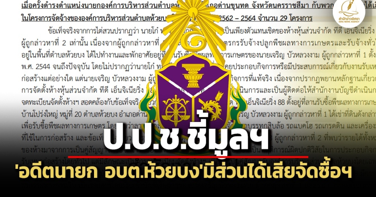 ‘ป.ป.ช.’ มีมติชี้มูลฯ ‘อดีตนายก อบต.ห้วยบง-พวก’ มีส่วนได้เสียจัดซื้อจัดจ้างฯโครงการของ ‘อบต.ห้วยบง’ 3 ปี รวม 49 โครงการ