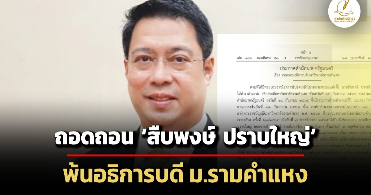 สำนักข่าวอิศรา (www.isranews.org) รายงานว่า วันที่ 28 ก.พ. 2569 เว็บไซต์ ราชกิจจานุเบกษา เผยแพร่ ประกาศสำนักนายกรัฐมนตรี เรื่อง ถอดถอนอธิการบดีมหาวิทยาลัยรามคำแหง