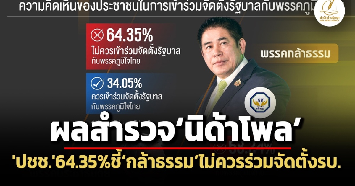 ‘นิด้าโพล’ เผยผลสำรวจฯ พบ ‘ประชาชน’ 64.35% ระบุ ‘พรรคกล้าธรรม’ ไม่ควรเข้าร่วมจัดตั้ง ‘รัฐบาล’ ร่วมกับ ‘พรรคภูมิใจไทย’