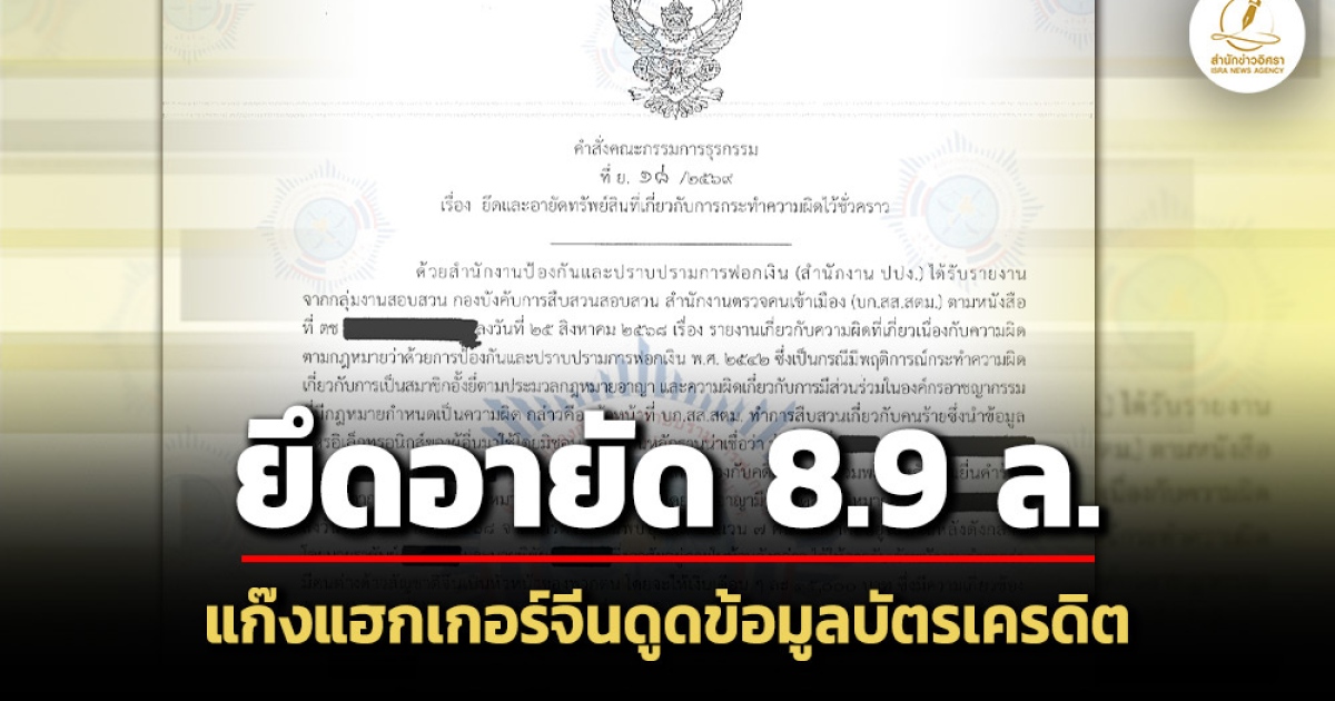 ปปง.ยึดอายัดทรัพย์สินเครือข่าย 'ยูเป็ง' แฮกเกอร์จีน พร้อมพวก รวม 25 รายการ มูลค่าเกือบ 9 ล้านบาท หลัง สตม. บุกทลายแก๊งนำข้อมูลบัตรเครดิตซื้อทองคำก่อนแปลงเป็นคริปโตฯ