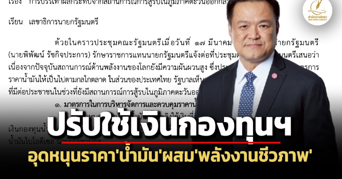 “ด้วยในคราวประชุมคณะรัฐมนตรีเมื่อวันที่ 17 มี.ค.2569 รองนายกรัฐมนตรี (นายพิพัฒน์ รัชกิจประการ) รักษาราชการแทนนายกรัฐมนตรี แจ้งต่อที่ประชุม ตามที่นายกรัฐมนตรี (นายอนุทิน ชาญวีรกูล) เสนอว่า เนื่องจากปัจจุบันสถานการณ์ด้านพลังงานของโลกยังมีความผันผวนสูง ซึ่งประเทศต่างๆ ได้เริ่มปรับมาตรการราคาน้ำมันให้เป็นไปตามกลไกตลาด ในส่วนของประเทศไทย รัฐบาลเห็นควรดำเนินมาตรการเพื่อบรรเทาผลกระทบที่มีต่อประชาชนในช่วงที่ยังมีสถานการณ์การสู้รบในภูมิภาคตะวันออกกลาง จึงขอมอบหมาย ดังนี้