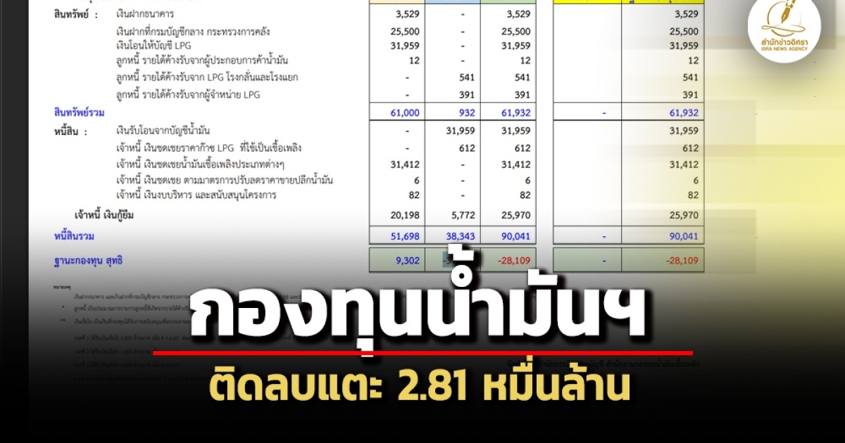 เมื่อวันที่ 23 มี.ค. สำนักข่าวอิศรา (www.isranews.org) รายงานว่า สำนักงานกองทุนน้ำมันเชื้อเพลิง (สกนช.) ได้รายงานประมาณการฐานะกองทุนน้ำมันเชื้อเพลิงสิ้นสุด ณ วันที่ 22 มี.ค.2569 ปรากฏว่ากองทุนน้ำมันฯติดลบสุทธิ 28,109 ล้านบาท ประกอบด้วย บัญชีน้ำมันเป็นบวกที่ 9,302 ล้านบาท และบัญชี LPG ติดลบ -37,411 ล้านบาท เทียบกับเมื่อสัปดาห์ก่อน (สิ้นสุด ณ 15 มี.ค.2569) ที่ฐานะกองทุนน้ำมันเชื้อเพลิงสุทธิติดลบ 12,605 ล้านบาท หรือเพิ่มขึ้น 15,504 ล้านบาท
