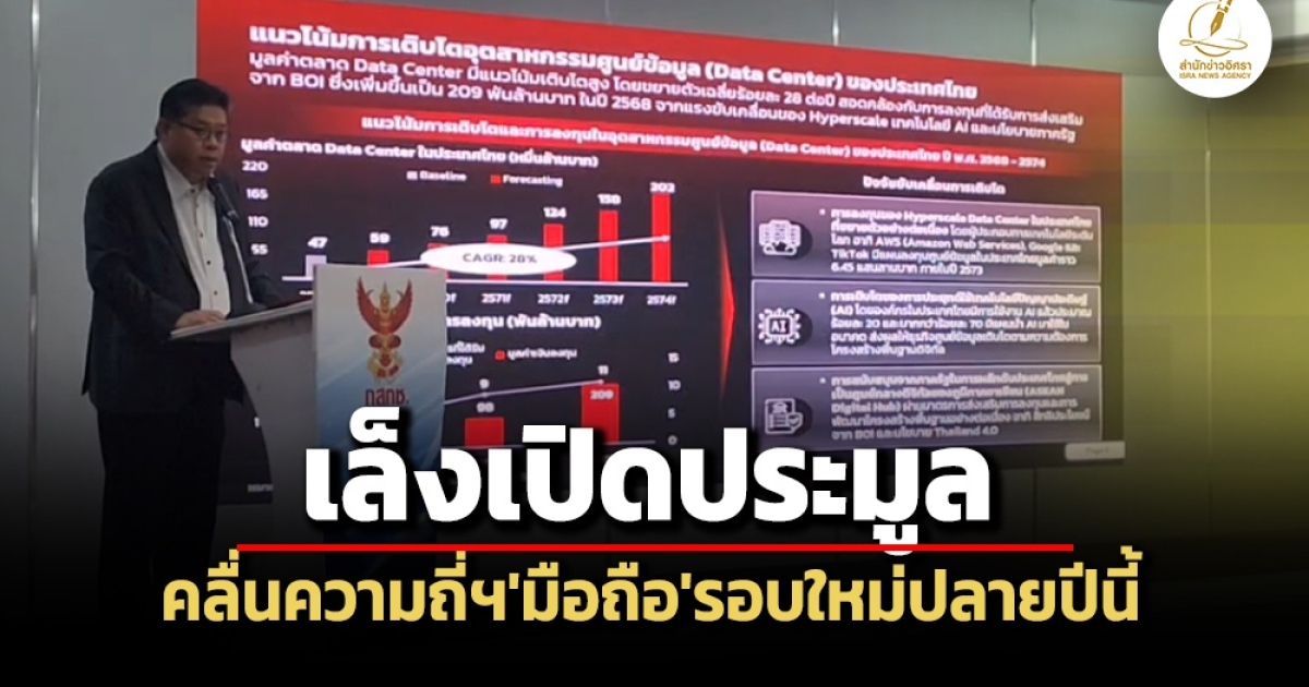 ‘สำนักงาน กสทช.’ เผยแนวโน้มมูลค่าตลาดสื่อสารไทยปี 2569 แตะ 8.05 แสนล้าน รับแรงหนุน ‘บริการดิจิทัล-AI’ ชี้ 3 ปัจจัย สนับสนุนอุตสาหกรรม ‘Data Center’ โตต่อเนื่อง จ่อเปิดประมูลคลื่น 2100 MHz และ 3500 MHz รวมถึงคลื่นฯที่เหลือจากการประมูลรอบที่แล้ว ในช่วงปลายปีนี้ เพิ่มประสิทธิภาพความเร็วเน็ตสู่ระดับ 5.5G