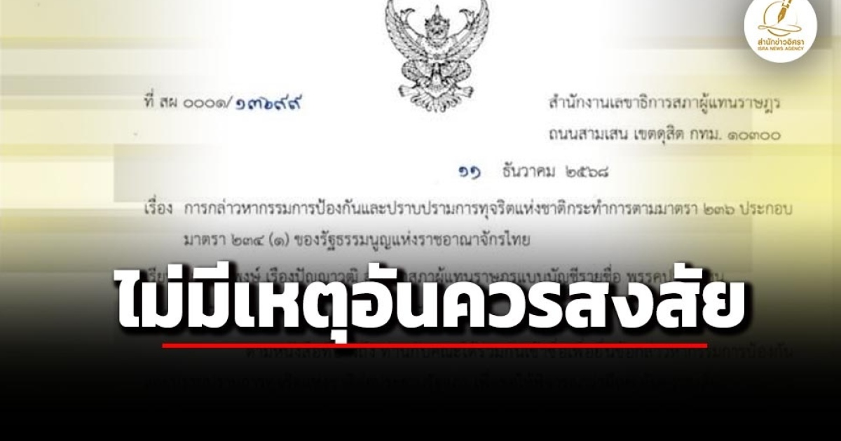 สำนักข่าวอิศรา (www.isranews.org) รายงานว่า วันที่ 22 เมษายน 2569 นายพริษฐ์ วัชรสินธุ สส.บัญชีรายชื่อ พรรคประชาชน (ปชน.) โพสต์เฟซบุ๊ก ‘พริษฐ์ วัชรสินธุ - ไอติม - Parit Wacharasindhu’ ว่า นายวันมูหะมัดนอร์ มะทา ประธานสภาผู้แทนราษฎร ในฐานะประธานรัฐสภาในขณะนั้น (สภาฯชุดที่แล้ว) ไม่รับคำร้องของสมาชิกรัฐสภา จำนวน 140 คน ที่กล่าวหากรรมการป้องกันและปราบปรามการทุจริตแห่งชาติ (ป.ป.ช.) กรณียุติหาข้อเท็จจริงและการไม่ปฏิบัติตามคำพิพากษาศาลปกครองคดีนาฬิกาของ พล.อ.ประวิตร วงษ์สุวรรณ อดีตรองนายกรัฐมนตรี รัฐบาลพล.อ.ประยุทธ์ และกรณีคลิปหลุดการสนทนาระหว่าง กรรมการ ป.ป.ช.ในขณะนั้น (ปัจจุบันเป็นประธาน ป.ป.ช.) เข้าพบนายวันมูหะมัดนอร์ โดยยื่นให้ประธานศาลฎีกาเพื่อตั้งคณะผู้ไต่สวนอิสระไต่สวนหาข้อเท็จจริงและทำความเห็นเกี่ยวกับข้อกล่าวหาดังกล่าว พร้อมทั้งเผยแพร่เอกสารที่เป็นหนังสือ สำนักงานเลขาธิการสภาผู้แทนราษฎร ที่ สผ 0001/13699 ลงวันที่ 11 ธ.ค.2568 (ยุบสภาวันที่ 12 ธ.ค.2568) โดยนายศิโรจน์ แพทย์พันธุ์ เลขาธิการสภาผู้แทนราษฎร ระบุผลการพิจารณาข้อกล่าวหาดังกล่าวว่า ‘ไม่มีเหตุอันควรสงสัยว่า กรรมการ ป.ป.ช. ได้กระทำการตามที่ถูกกล่าวหา’ โดยมีรายละเอียด ดังนี้