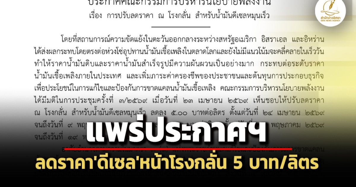 สำนักข่าวอิศรา (www.isranews.org) รายงานว่า เมื่อวันที่ 23 เม.ย.ที่ผ่านมา เว็บไซต์ราชกิจจานุเบกษา เผยแพร่ประกาศคณะกรรมการบริหารนโยบายพลังงาน เรื่อง การปรับลดราคา ณ โรงกลั่น สำหรับน้ำมันดีเซลหมุนเร็ว ซึ่งมีเนื้อหาว่า โดยที่สถานการณ์ความขัดแย้งในตะวันออกกลางระหว่างสหรัฐอเมริกา อิสราเอล และอิหร่าน ได้ส่งผลกระทบโดยตรงต่อห่วงโซ่อุปทานน้ำมันเชื้อเชื้อเพลิงในตลาดโลกและยังไม่มีแนวโน้มจะคลี่คลายในเร็ววัน ทำให้ราคาน้ำมันดิบและราคาน้ำมันสำเร็จรูปมีความผันผวนเป็นอย่างมาก กระทบต่อระดับราคาน้ำมันเชื้อเพลิงภายในประเทศ และเพิ่มภาระค่าครองชีพของประชาชนและต้นทุนการประกอบธุรกิจ