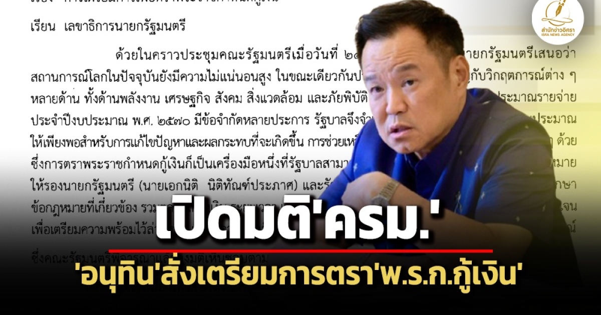 สำนักข่าวอิศรา (www.isranews.org) รายงานว่า ในการประชุมคณะรัฐมนตรี (ครม.) เมื่อวันที่ 21 เม.ย.ที่ผ่านมา นายอนุทิน ชาญวีรกูล นายกรัฐมนตรี และรมว.มหาดไทย ได้มอบหมายให้นายเอกนิติ นิติทัณฑ์ประภาศ รองนายกรัฐมนตรี และรมว.คลัง ไปศึกษาและเตรียมการตรา พ.ร.ก.กู้เงินฯ เพื่อเป็นเครื่องมือหนึ่งที่รัฐบาลสามารถนำมาใช้วิกฤตการณ์ต่างๆ ทั้งด้านพลังงาน เศรษฐกิจ สังคม สิ่งแวดล้อม และภัยพิบัติ