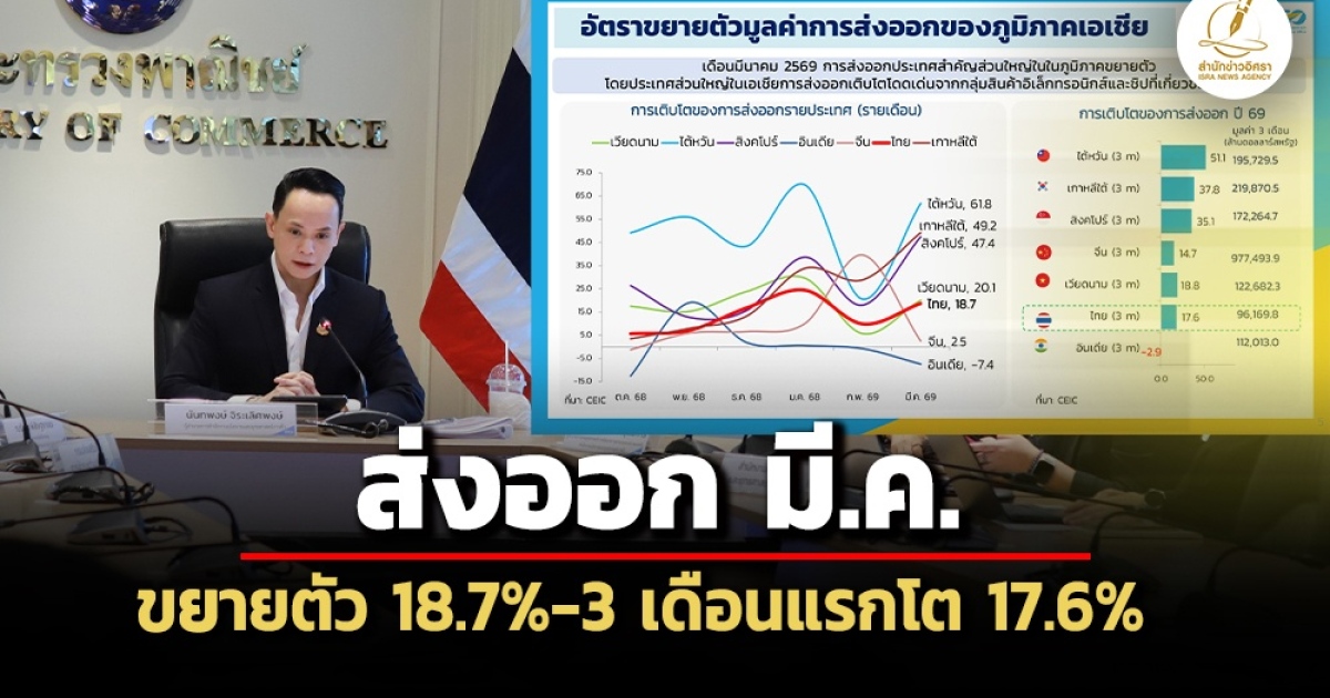 ‘พาณิชย์’ เผยส่งออกไทย มี.ค.69 ขยายตัว 18.7% โตต่อเนื่อง 21 เดือน มูลค่าสูงสุดเป็นประวัติการณ์ที่ 35,157 ล้านดอลลาร์สหรัฐ ขณะที่ ‘การนำเข้า’ โตพุ่ง 35.7% ประเมินส่งออกทั้งปี 69 ดีสุดโต 8% แย่สุดติดลบ 3%