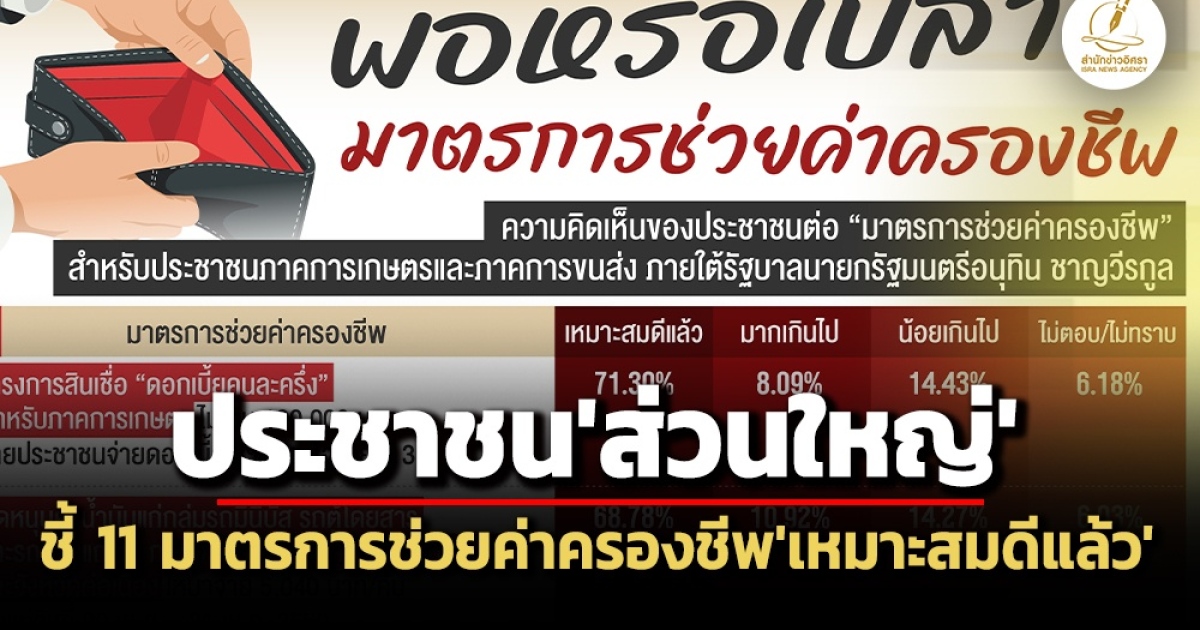 จากการสำรวจเมื่อถามความคิดเห็นของประชาชนต่อ “มาตรการช่วยค่าครองชีพ” สำหรับประชาชน ภาคการเกษตรและภาคการขนส่ง ภายใต้รัฐบาลนายกรัฐมนตรีอนุทิน ชาญวีรกูล พบว่า