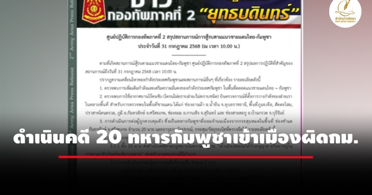 กองทัพภาคที่ 2 เผยส่งตำรวจดำเนินคดี 20 ทหารกัมพูชา ฐานเข้าเมืองผิดกฎหมาย