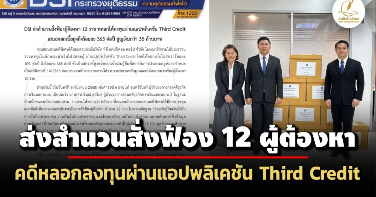 DSI ส่งสำนวนสั่งฟ้อง 12 ผู้ต้องหา คดีหลอกลงทุนผ่านแอปพลิเคชัน Third Credit ข้อหาฉ้อโกงประชาชน-นำเข้าข้อมูลเท็จ-มูลค่าความเสียหาย 34 ล้านบาท