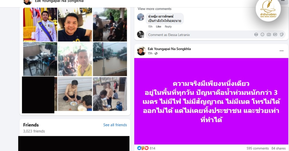 ล่าสุด นายเอก ยังอภัย ณ สงขลา โพสต์ข้อความผ่านเฟซบุ๊ก Eak Youngapai Na Songkhla ระบุว่า ความจริงมีเพียงหนึ่งเดียว อยู่ในพื้นที่ทุกวัน ปัญหาคือน้ำท่วมหนักกว่า 3 เมตร ไม่มีไฟ ไม่มีสัญญาณ ไม่มีเน็ต โทรฯ ไม่ได้ ออกไม่ได้ แต่ไม่เคยทิ้งประชาชน และช่วยเท่าที่ทำได้