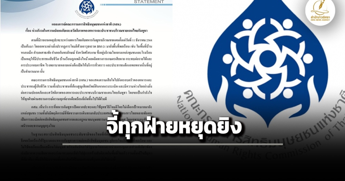 กสม.ออก แถลงการณ์ห่วงสถานการณ์ปะทะชายแดนไทย-กัมพูชา หลังยิงจรวดใส่พื้นที่พลเรือน ประณามพฤติการณ์ละเมิดสิทธิมนุษยชน-กฎหมายมนุษยธรรมระหว่างประเทศ เรียกร้องให้ทุกฝ่ายยุติการโจมตี เร่งเยียวยา และหาทางสร้างสันติภาพในพื้นที่โดยเร็ว