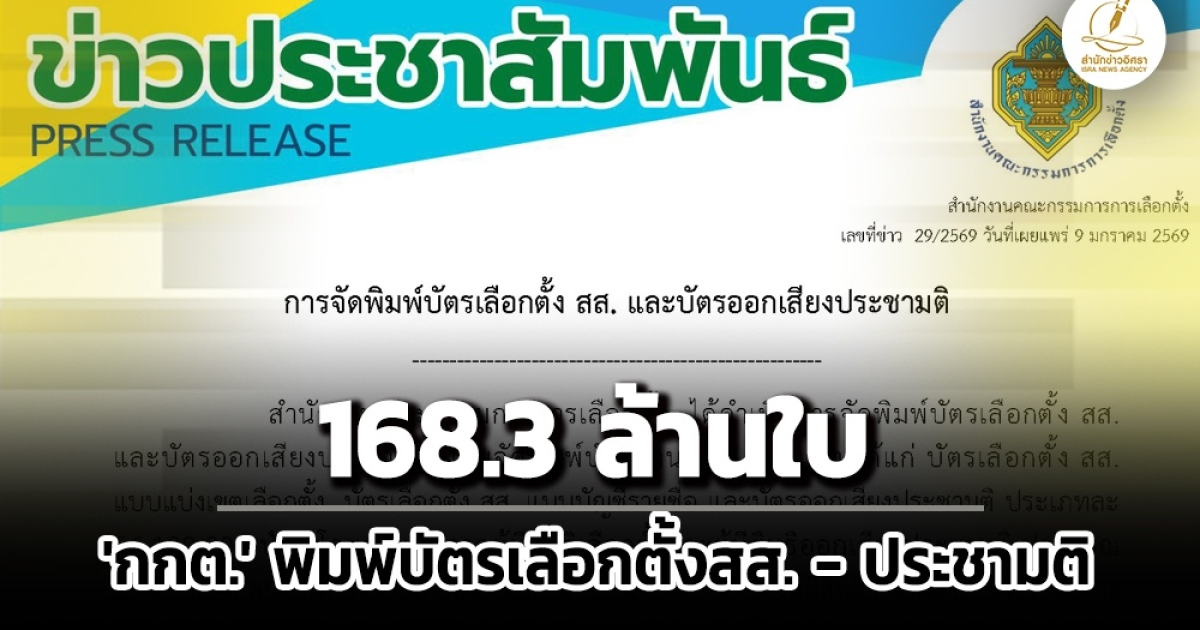 สำนักข่าวอิศรา (www.isranews.org) รายงานว่า วันที่ 9 มกราคม 2569 สำนักงานคณะกรรมการการเลือกตั้ง (กกต.) เผยแพร่ข่าวประชาสัมพันธ์ (PRESS RELEASE) การจัดพิมพ์บัตรเลือกตั้งสมาชิกสภาผู้แทนราษฎร (สส.) และบัตรออกเสียงประชามติ โดยจัดพิมพ์บัตรจำนวน 3 ประเภท ได้แก่ บัตรเลือกตั้ง สส.แบบแบ่งเขตเลือกตั้ง บัตรเลือกตั้ง สส. แบบบัญชีรายชื่อ และบัตรออกเสียงประชามติ ประเภทละ 56,100,000 บัตร (รวม 3 ประเภท 168.3 ล้านใบ) โดยคำนวณจากผู้มีสิทธิเลือกตั้งและผู้มีสิทธิออกเสียงประชามติ ประมาณ 53,400,000 คน บวกจำนวนสำรองประมาณร้อยละ 5 ของจำนวนผู้มีสิทธิฯ ดังกล่าว เพื่อใช้ในการจัดสรรบัตรเพื่อใช้ในการออกเสียงลงคะแนน จำนวน 3 รอบ ดังนี้