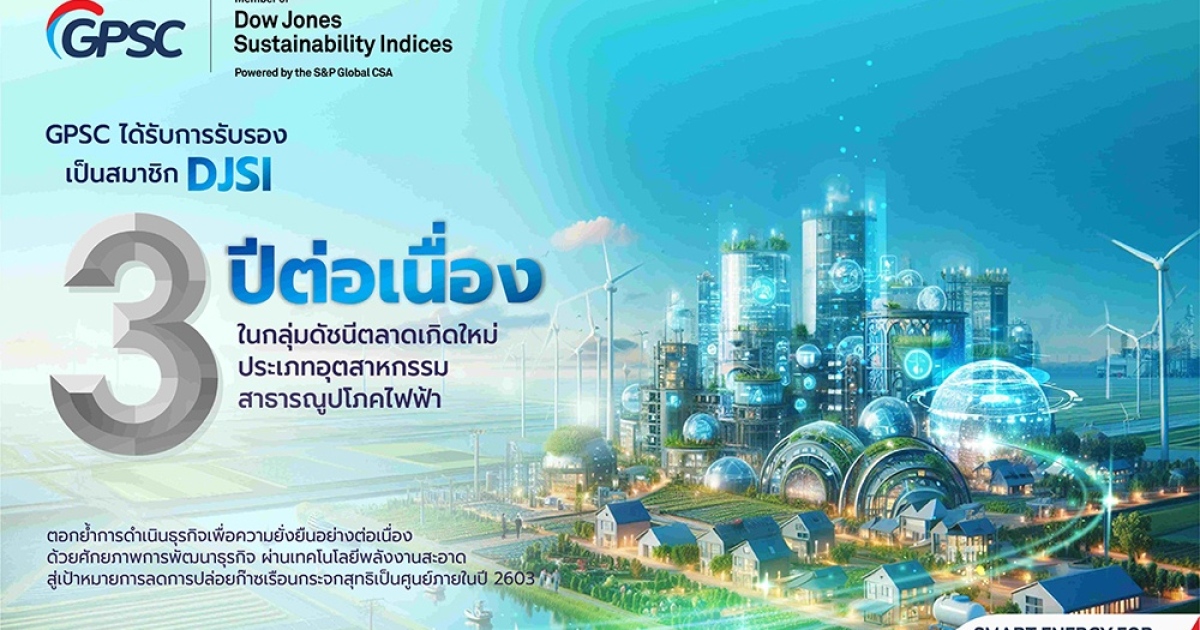 GPSC บริษัทนวัตกรรมพลังงาน รักษาอันดับธุรกิจยั่งยืน DJSI ปีที่ 3 กลุ่มดัชนีตลาดเกิดใหม่ประเภทอุตสาหกรรมสาธารณูปโภคไฟฟ้า ปี 2567 โชว์ศักยภาพการพัฒนาธุรกิจด้วยเทคโนโลยีพลังงานสะอาด ตอบโจทย์ด้านการลดการปล่อยคาร์บอนไดออกไซต์ พัฒนา CCS – SMR – ไฮโดรเจน ตอกย้ำความสำเร็จในการขับเคลื่อนธุรกิจอย่างยั่งยืน ตามกลยุทธ์ 4S สู่เป้าหมายเพิ่มสัดส่วนพลังงานหมุนเวียนให้มากกว่า 50% ในปี 2573 และลดการปล่อยก๊าซเรือนกระจกสุทธิเป็นศูนย์ภายในปี 2603