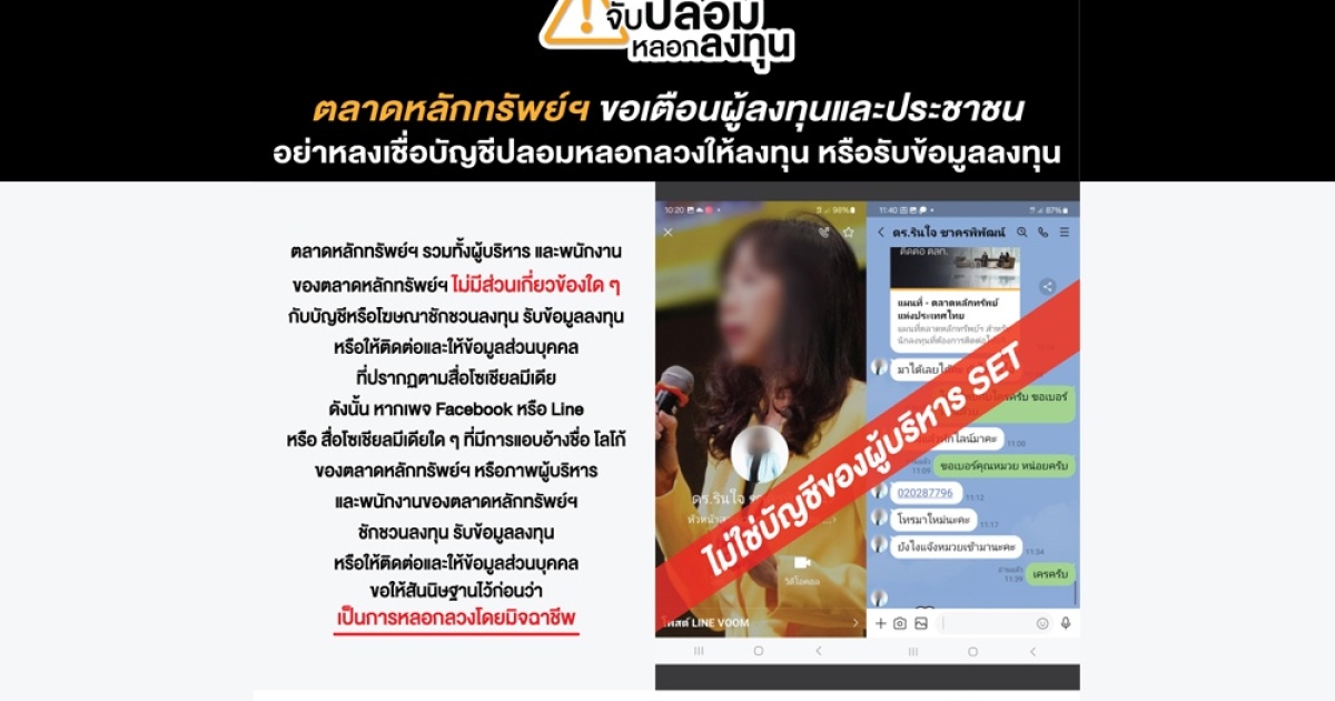 ตามที่มีกลุ่มมิจฉาชีพได้แอบอ้างชื่อและภาพของผู้บริหารตลาดหลักทรัพย์แห่งประเทศไทย (“ตลาดหลักทรัพย์ฯ”) เพื่อนำไปใช้ในการชักชวนหรือหลอกลวงประชาชนทั่วไปให้มาร่วมลงทุน หรือรับข้อมูลการลงทุน ผ่านช่องทาง LINE Application นั้น