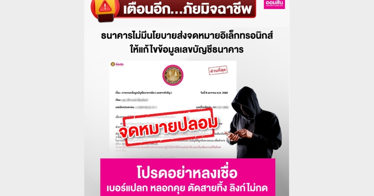 ออมสินเตือนอีก มุขใหม่มิจฉาชีพ ปลอมเอกสารเหมือนธนาคารส่งเป็นจดหมาย ย้ำ! ต้องเช็คธนาคารทุกครั้งว่าจริงหรือมั่ว ก่อนสูญเงินหมดตัว