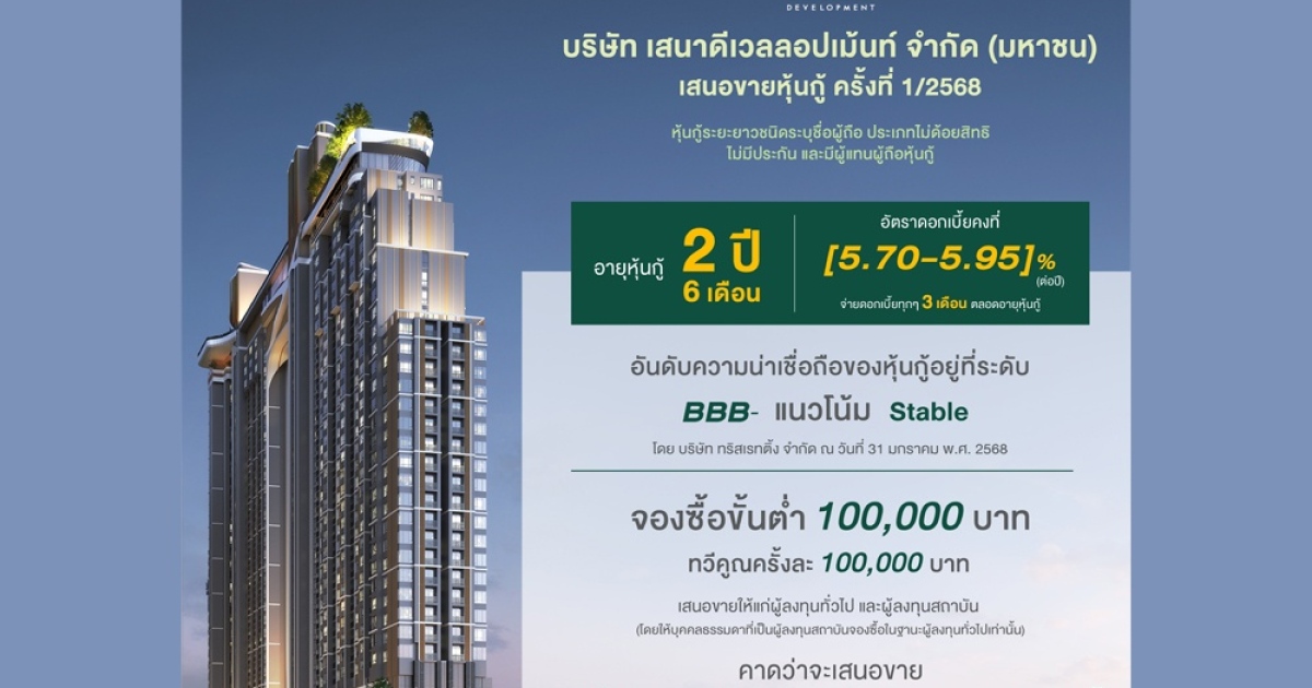 นางสาวอธิกา บุญรอดชู ผู้ช่วยกรรมการผู้จัดการ สายงานจัดสรรเงินและการลงทุน บริษัท เสนาดีเวลลอปเม้นท์ จำกัด (มหาชน) หรือ SENA เปิดเผยว่า บริษัทเตรียมออกและเสนอขายหุ้นกู้ชุดใหม่ ซึ่งจะเป็นหุ้นกู้ระยะยาว ชนิดระบุชื่อผู้ถือ ประเภทไม่ด้อยสิทธิ ไม่มีหลักประกัน และมีผู้แทนถือหุ้นกู้ อายุ 2 ปี 6 เดือน อัตราดอกเบี้ยคงที่ [5.70-5.95]% ต่อปี ชำระดอกเบี้ยทุก 3 เดือน ตลอดอายุหุ้นกู้ ซึ่งคาดว่าจะเสนอขายระหว่างวันที่ 14 และ 17 ถึง 18 มีนาคม พ.ศ. 2568 นี้ ผ่าน 12 สถาบันการเงินชั้นนำ ได้แก่ บล.เอเซีย พลัส, บล.หยวนต้า (ประเทศไทย), บล.กรุงไทย เอ็กซ์สปริง, บล.โกลเบล็ก, บมจ. หลักทรัพย์ พาย, บมจ. หลักทรัพย์ ดาโอ (ประเทศไทย), บมจ. หลักทรัพย์ บียอนด์ , บมจ. หลักทรัพย์ เมย์แบงก์ (ประเทศไทย), บมจ. หลักทรัพย์ เมอร์ชั่น พาร์ทเนอร์ , บล.ทรีนีตี้, บล.บลูเบลล์ และ บล.เอเอสแอล โดยผู้ลงทุนสถาบันสามารถจองซื้อหุ้นกู้ขั้นต่ำ 100,000 บาท และทวีคูณครั้งละ 10,000 บาท และผู้ลงทุนทั่วไปสามารถจองซื้อหุ้นกู้ขั้นต่ำ 100,000 บาท และทวีคูณครั้งละ 100,000 บาท การจองซื้อหุ้นกู้ในช่วงวันเสาร์และวันอาทิตย์สามารถทำได้ผ่านผู้จัดการการจัดจำหน่ายบางรายและช่องทางบางช่องทางเท่านั้น