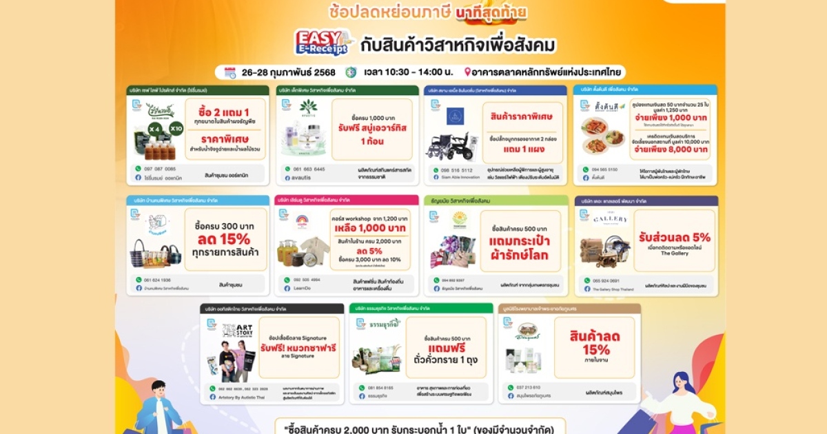 ตลาดหลักทรัพย์ฯ ชวนคนไทยร่วมมหกรรมช้อปลดหย่อนภาษีนาทีสุดท้าย Easy E-Receipt 2.0 กับสินค้าจาก 11 วิสาหกิจเพื่อสังคม 26-28 ก.พ.