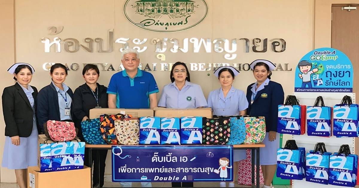 b รองกรรมการผู้จัดการใหญ่ ดั๊บเบิ้ล เอ เป็นตัวแทนเข้ามอบถุงใส่ยารักษ์โลกจากเปลือกห่อกระดาษ และถุงผ้าเย็บมือจากครอบครัวพนักงาน จำนวน 2,500 ใบ ให้กับโรงพยาบาลเจ้าพระยาอภัยภูเบศร จังหวัดปราจีนบุรี เพื่อใช้บรรจุยาสำหรับผู้ป่วย และสามารถนำมาใช้ซ้ำได้หลายครั้ง ลดการใช้ถุงพลาสติกใหม่ รวมทั้งยังช่วยสร้างรายได้ให้กับผู้พิการในชุมชนจากการจ้างงานพับถุงใส่ยาอีกด้วย ภายใต้แคมเปญ Double A Go Green กับโครงการ "กระดาษแปลงร่าง ถุงยารักษ์โลก" โดยมี แพทย์หญิงสุภาพร ภู่พิทยา รองผู้อำนวยการโรงพยาบาล และเจ้าหน้าที่พยาบาล เป็นตัวแทนรับมอบ
