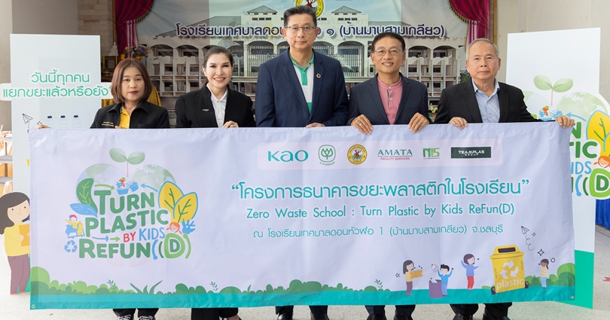 เมื่อเร็วๆ นี้ นายสุทธิพงค์ ลิ่มศิลา หัวหน้าฝ่ายกลยุทธ์องค์กร บริษัท คาโอ อินดัสเตรียล (ประเทศไทย) จำกัด (กลาง) และนางศิริพร เดชสิงห์ ประธานเจ้าหน้าที่บริหาร สายงานความยั่งยืนและสื่อสารองค์กร บริษัท ซีพี แอ็กซ์ตร้า จำกัด (มหาชน) ในฐานะผู้แทนเครือเจริญโภคภัณฑ์ (ซีพี) (ที่ 2 จากซ้าย) พร้อมพันธมิตรภาครัฐและเอกชน ได้แก่ นายอัครเรศร์ ชูช่วย กรรมการผู้จัดการ บริษัท อมตะ ฟาซิลิตี้ เซอร์วิส จำกัด (ที่ 2 จากขวา), นายสุรพงษ์ อติชาดศรีสกุล กรรมการผู้จัดการบริษัท ทีมพลาส เคมีคอล จำกัด (ขวาสุด) และ นางสาวสุพิชฌาย์ ปานผดุง รองนายกเทศมนตรี ตำบลดอนหัวฬ่อ (ซ้ายสุด) ร่วมเปิดโครงการ Zero Waste School : Turn Plastic by Kids Refun(D) จัดตั้งธนาคารขยะพลาสติกในโรงเรียน เพื่อมุ่งปลูกจิตสำนึกเด็กไทยรู้คุณค่าขยะรีไซเคิล ร่วมกันลดขยะ และนำขยะพลาสติกเหล่านั้นกลับมาปฏิรูปใช้ใหม่ให้เกิดประโยชน์สูงสุด โดยริเริ่มโครงการ ณ โรงเรียนเทศบาลดอนหัวฬ่อ 1 (บ้านมาบสามเกลียว) เป็นแห่งแรก เพื่อเป็นโมเดลในการจัดการขยะพลาสติกในชุมชนโดยมีโรงเรียนเป็นสื่อกลางและขยายผลไปยังโรงเรียนหรือในชุมชนอื่นต่อไป