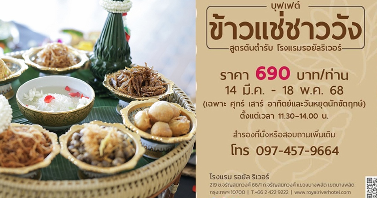 และอีกหลากหลายเมนูคาว หวาน เครื่องดื่มสมุนไพร รวมอยู่ใน “บุฟเฟต์ ข้าวแช่ชาววัง สูตรต้นตำรับโรงแรมรอยัล ริเวอร์” ระหว่างวันศุกร์ที่ 14 มีนาคม ถึง วันอาทิตย์ที่ 18 พฤษภาคม 2568 ตั้งแต่เวลา 11.30-14.00 น. เฉพาะวันศุกร์ เสาร์ อาทิตย์และวันหยุดนักขัตฤกษ์ ในราคาท่านละ 690 บาทสุทธิ ซื้อกลับบ้านราคาชุดละ 400 บาทสุทธิ สำรองที่นั่งหรือสอบถามข้อมูลเพิ่มเติม โทร 097-457-9664