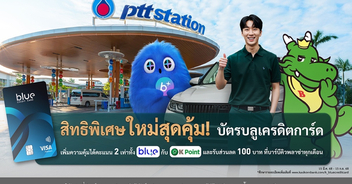 บัตรบลูเครดิตการ์ด (Blue Credit Card) บัตรเครดิตร่วมระหว่างธนาคารกสิกรไทย กับ บริษัท ปตท. น้ำมันและการค้าปลีก จำกัด (มหาชน) หรือโออาร์ (“OR”) เพิ่มสิทธิพิเศษใหม่ เพิ่มความคุ้มค่าทุกการใช้จ่าย รับคะแนนเพิ่ม 2 เท่า ได้คะแนน 2 ต่อ ได้ทั้งคะแนน Blue+ กับ K Point เมื่อใช้จ่ายที่ PTT Station และ EV Station PluZ พร้อมรับส่วนลดบาร์บีคิว พลาซ่า มูลค่า 100 บาท เมื่อช้อปครบ 5,000 บาท/เดือน ตั้งแต่วันที่ 15 มีนาคม 2568 - 15 กันยายน 2568 รายละเอียด ดังนี้