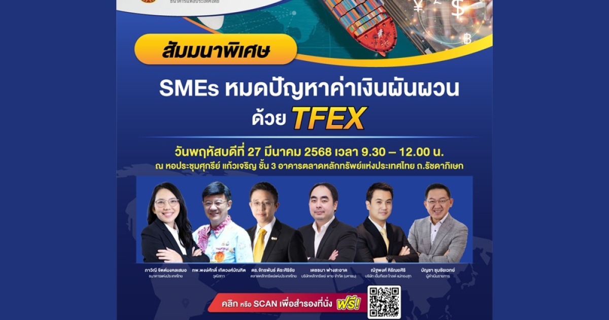 บมจ. ตลาดสัญญาซื้อขายล่วงหน้า (ประเทศไทย) (TFEX) ร่วมกับ วุฒิสภา และธนาคารแห่งประเทศไทย ขอเชิญผู้ประกอบการและผู้ที่สนใจร่วมฟังสัมมนาพิเศษ “SMEs หมดปัญหาค่าเงินผันผวน ด้วย TFEX” พบกับผู้เชี่ยวชาญที่จะมาให้ความรู้อย่างครบเครื่อง วิเคราะห์แนวโน้มสถานการณ์โลก เศรษฐกิจ การค้า และค่าเงินที่ส่งผลต่อธุรกิจ รู้จักเครื่องมือบริหารความเสี่ยงอัตราแลกเปลี่ยน Currency Futures ใน TFEX พร้อมแชร์ประสบการณ์จริงจากผู้ประกอบการที่ใช้ Currency Futures บริหารความเสี่ยงอัตราแลกเปลี่ยนเพื่อเสริมแกร่งให้กับธุรกิจ วันพฤหัสบดีที่ 27 มี.ค. 68 เวลา 9.30-12.00 น. ณ อาคารตลาดหลักทรัพย์ฯ ถ.รัชดาภิเษก