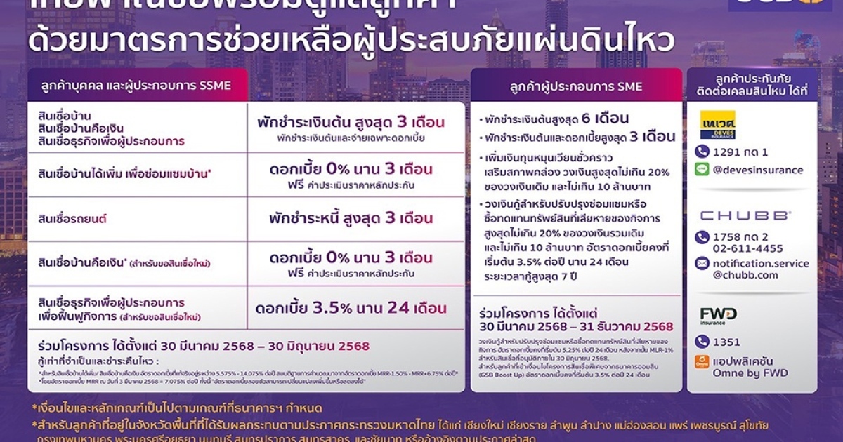 จากเหตุการณ์แผ่นดินไหวเมื่อวันที่ 28 มีนาคม 2568 ได้สร้างความเสียหายส่งผลกระทบต่อทรัพย์สินและความเป็นอยู่ของประชาชนในหลายพื้นที่ของประเทศไทย ธนาคารไทยพาณิชย์มีความห่วงใยลูกค้าและพร้อมอยู่เคียงข้างให้การช่วยเหลือและบรรเทาความเดือดร้อนให้แก่ลูกค้าผู้ได้รับผลกระทบจากอุบัติภัยครั้งนี้ ด้วยมาตรการเร่งด่วน ครอบคลุมทั้งลูกค้าบุคคล ลูกค้าผู้ประกอบการเอสเอ็มอีอย่างเต็มที่ ทั้งการพักชำระเงินกู้แก่ลูกค้าปัจจุบัน และให้สินเชื่อใหม่เพื่อการซ่อมแซมที่อยู่อาศัย และฟื้นฟูกิจการที่ได้รับผลกระทบ ประกอบด้วย ดังนี้