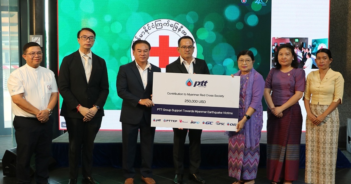 กลุ่ม ปตท. มอบเงินบริจาคให้แก่สภากาชาดเมียนมา จำนวน 250,000 ดอลลาร์สหรัฐ โดยมี นายฐิติ ทองเย็น รองกรรมการผู้จัดการใหญ่ กลุ่มงานโครงการผลิตต่างประเทศ บริษัท ปตท.สำรวจและผลิตปิโตรเลียม จำกัด (มหาชน) (ปตท.สผ.) เป็นผู้แทนส่งมอบ และ Prof. Dr. Marlar Win, Executive Committee Member of Myanmar Red Cross Society เป็นผู้แทนรับมอบ ณ สำนักงาน ปตท.สผ. โครงการเมียนมา ประเทศเมียนมา โดยมี นายยอดยิ่ง ศุภศรี อัครราชทูตที่ปรึกษา สถานเอกอัครราชทูต ณ กรุงย่างกุ้ง ร่วมเป็นสักขีพยาน นอกจากนี้ นายพิจินต์ อภิวันทนาพร รองกรรมการผู้จัดการใหญ่ บัญชีและการเงิน บริษัท ไออาร์พีซี จำกัด (มหาชน) ได้สนับสนุนผ้าพลาสติกสานเคลือบสารกันน้ำ จำนวน 2,000 ผืน ให้แก่กองทัพไทย โดยมี พลตรี วิทัย ลายถมยา ผู้อำนวยการสำนักประชาสัมพันธ์ กรมกิจการพลเรือนทหาร เป็นผู้แทนรับมอบ เพื่อใช้ประโยชน์ในการช่วยเหลือผู้ประสบภัยแผ่นดินไหวในประเทศเมียนมาต่อไป