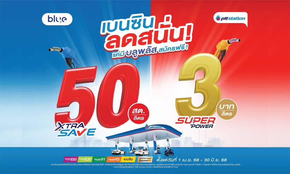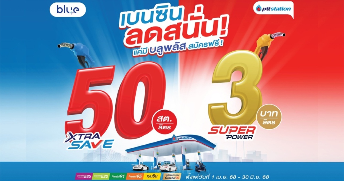- สถานีบริการ พีทีที สเตชั่น มอบโปรโมชันพิเศษ “เบนซินลดสนั่น ” สำหรับสมาชิกบลูพลัส เมื่อเติมน้ำมันเกรดมาตรฐาน XTRA SAVE กลุ่มเบนซินและแก๊สโซฮอล์ ไม่ว่าจะเป็น เบนซิน แก๊สโซฮอล์ 95 แก๊สโซฮอล์ 91 แก๊สโซฮอล์ E20 และ แก๊สโซฮอล์ E85 รับส่วนลดไปเลย 50 สตางค์ต่อลิตร และสำหรับผู้ที่ต้องการความแรงขั้นสุดแบบเต็มสปีด เลือกเติมน้ำมันเกรดพรีเมียม SUPER POWER แก๊สโซฮอล์ 95 การันตีความแรงระดับโลก ด้วยสารเพิ่มความแรง “Super Booster” รับส่วนลดเพิ่มเป็น 3 บาทต่อลิตร พิเศษ!! เพียงชำระค่าน้ำมันผ่าน xplORe wallet รับแต้มบลูพลัสคูณสองทันที เติมเท่าเดิม แต่ได้แต้มเพิ่มขึ้นแบบจุใจ นอกจากนี้ ยังได้น้ำดื่มขนาด 600 มล. ฟรี!! เมื่อเติมน้ำมันครบทุก 500 บาท ตั้งแต่วันที่ 1 เมษายน 2568 – 30 มิถุนายน 2568 ที่ พีทีที สเตชั่น ที่ร่วมรายการทั่วประเทศ นอกจากนี้ ยังมีโปรโมชั่น รับฟรี! น้ำดื่ม 600 มล.จำนวน 1 ขวด เมื่อเติมน้ำมันทุกชนิดครบทุก 500 ตั้งแต่วันที่ 1 มกราคม 2568 - 30 เมษายน 2568