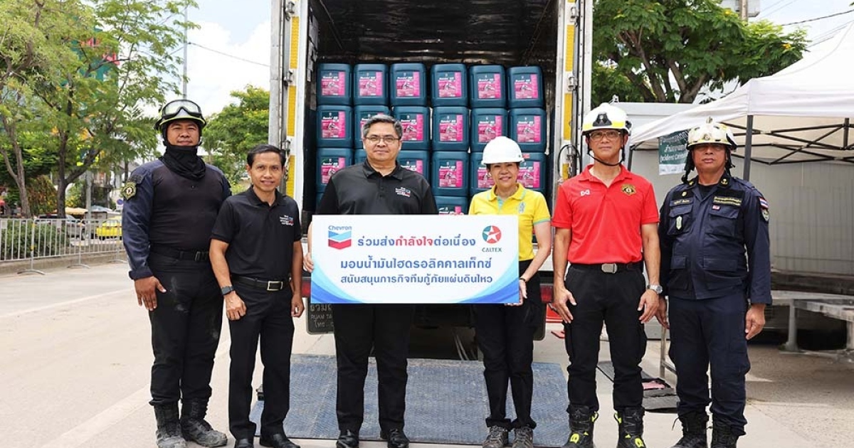 เมื่อเร็ว ๆ นี้ บริษัท เชฟรอน (ไทย) จำกัด ผู้ผลิตและจัดจำหน่ายผลิตภัณฑ์น้ำมันหล่อลื่นคาลเท็กซ์ ฮาโวลีน และคาลเท็กซ์ เดโล่ นำโดย นายสันติศักดิ์ ไทยพัฒน์ ประธานกรรมการและผู้จัดการใหญ่ บริษัท เชฟรอน (ไทย) จํากัด (ที่ 3 จากซ้าย) มอบน้ำมันไฮดรอลิค คาลเท็กซ์ แรนโด้ จำนวนรวม 1,620 ลิตร ให้แก่ นางสาวภัทร์กร สินสุข ผู้อำนวยการเขตจตุจักร กรุงเทพมหานคร (ที่ 3 จากขวา) เพื่อสนับสนุนการปฏิบัติภารกิจของเจ้าหน้าที่กู้ภัยในการใช้งานกับเครื่องจักรในการกู้ภัย อาทิ รถขุด รถเครน รถตัก และเครื่องมืออื่น ๆ สำหรับปฏิบัติการค้นหาผู้สูญหายที่คาดว่ายังติดอยู่ใต้ซากอาคารสำนักงานตรวจเงินแผ่นดิน (สตง.) ที่ถล่มลงมาหลังเหตุการณ์แผ่นดินไหว ให้เป็นไปได้อย่างราบรื่นและมีประสิทธิภาพมากยิ่งขึ้น ณ ศูนย์บัญชาการเหตุการณ์ จตุจักร กรุงเทพฯ