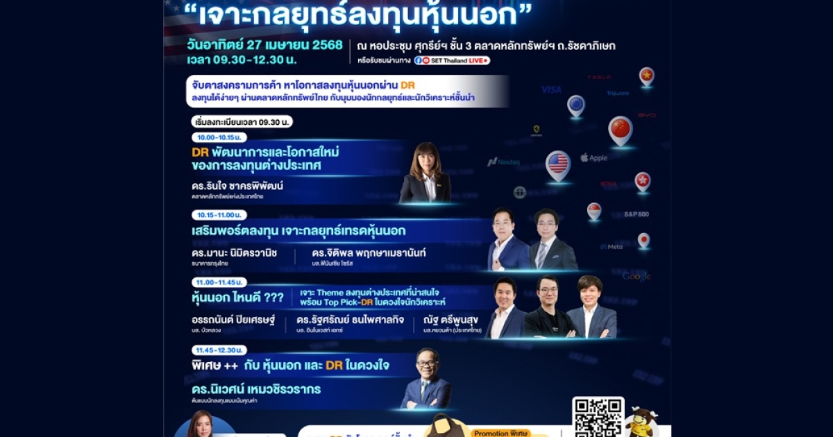 วันอาทิตย์ที่ 27 เมษายน 2568 เวลา 9.30-12.30 น. ณ อาคารตลาดหลักทรัพย์ฯ ชั้น 3 ถ. รัชดาภิเษก หรือรับชมได้ทางออนไลน์ LIVE! YouTube และ Facebook SET Thailand พิเศษ! สำหรับผู้ที่เปิดบัญชีลงทุน DR ภายในงานรับโปรโมชัน และโผ DR น่าลงทุน จากบริษัทหลักทรัพย์ 14 แห่งที่มาร่วมให้บริการในงาน ลงทะเบียนสำรองที่นั่งได้ที่ https://www.set.or.th/th/about/event-calendar/event/eventdetails?id=87684
