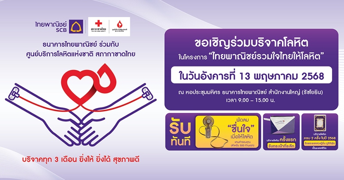 กลุ่มเอสซีบีเอกซ์ โดยธนาคารไทยพาณิชย์ ร่วมกับ ศูนย์บริการโลหิตแห่งชาติ สภากาชาดไทย ขอเชิญร่วมบริจาคโลหิต ภายใต้โครงการ “ไทยพาณิชย์รวมใจไทยให้โลหิต” ในวันอังคารที่ 13 พฤษภาคม 2568 เวลา 9.00-15.00 น. ณ หอประชุมมหิศร ธนาคารไทยพาณิชย์ สำนักงานใหญ่ (รัชโยธิน) เพื่อเติมเต็มและส่งต่อโลหิตที่มีคุณภาพให้มีเพียงพอต่อการรักษาพยาบาลผู้ป่วยทั่วประเทศ ยังมีผู้ป่วยจำนวนมากที่กำลังรอรับโลหิตเพื่อต่อลมหายใจ ทุก ๆ การบริจาคโลหิต 1 ครั้ง สามารถนำไปช่วยชีวิตผู้ป่วยได้มากกว่า 3 ชีวิต สำหรับผู้ที่บริจาคโลหิตครั้งแรกรับทันทีกระเป๋าที่ระลึก บริจาคโลหิตครบ 2 ครั้งในปี 2568 รับพระผงหลวงปู่มั่น ภูริทตฺโต เป็นมงคลชีวิต และ 500 ท่านแรกที่ร่วมบริจาคโลหิต รับพัดลม “ชื่นใจ” แทนคำขอบคุณ