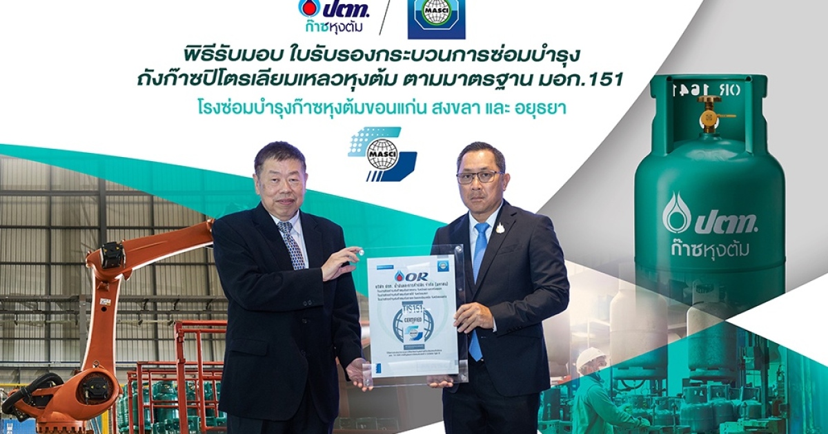 หม่อมหลวงปีกทอง ทองใหญ่ ประธานเจ้าหน้าที่บริหาร บริษัท ปตท. น้ำมันและการค้าปลีก จำกัด (มหาชน) หรือ OR รับมอบใบรับรองกระบวนการซ่อมบำรุงถังก๊าซปิโตรเลียวเหลวหุงต้ม ตามมาตรฐาน มอก.151 จาก นายจงรักษ์ โรจน์พลาเสถียร ผู้อำนวยการสถาบันรับรองมาตรฐานไอเอสโอ ตอกย้ำความมั่นใจให้ผู้บริโภคก๊าซหุงต้ม ปตท. ผ่านการยกระดับมาตรฐานด้านความปลอดภัยอย่างต่อเนื่อง โดยโรงซ่อมถังก๊าซหุงต้ม ปตท. ทั้ง 3 แห่ง ได้แก่ โรงซ่อมถังก๊าซหุงต้ม ปตท. จ.พระนครศรีอยุธยา สงขลา และ ขอนแก่น ผ่านการรับรองกระบวนการซ่อมบำรุงถังก๊าซปิโตรเลียวเหลวหุงต้ม ตามมาตรฐาน มอก.151 ซึ่งเป็นมาตรฐานกระบวนการซ่อมบำรุง การตรวจสอบ และการทดสอบถังก๊าซปิโตรเลียมเหลวหุงต้มที่มีการกำหนดมาตรฐานหลักเกณ์ วิธีการ และ เครื่องมือที่ใช้การดำเนินการ ซึ่งกำหนดโดยสำนักงานมาตรฐานผลิตภัณฑ์อุตสาหกรรม (สมอ.) กระทรวงอุตสาหกรรม ถือเป็นบริษัทแรกของประเทศไทยที่ผ่านการรับรองในกระบวนการนี้