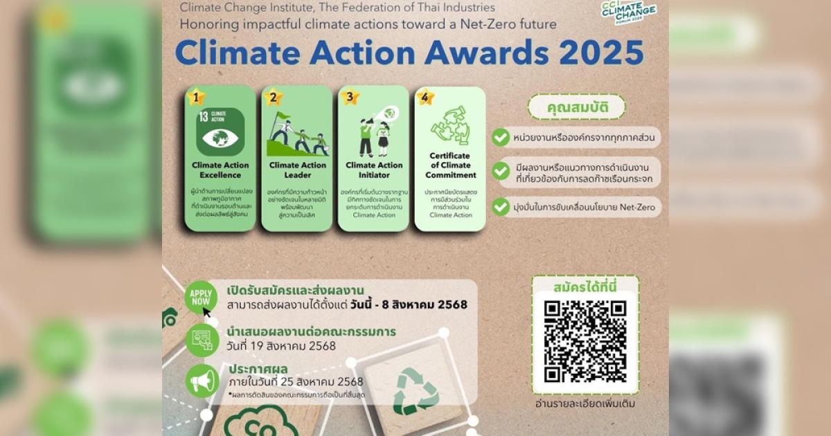 สถาบันการเปลี่ยนแปลงสภาพภูมิอากาศ (CCI) สภาอุตสาหกรรมแห่งประเทศไทย เชิญร่วมส่งผลงานเข้าประกวด Climate Action Awards 2025 เพื่อการขับเคลื่อนสู่ Net-Zero อย่างเป็นรูปธรรม