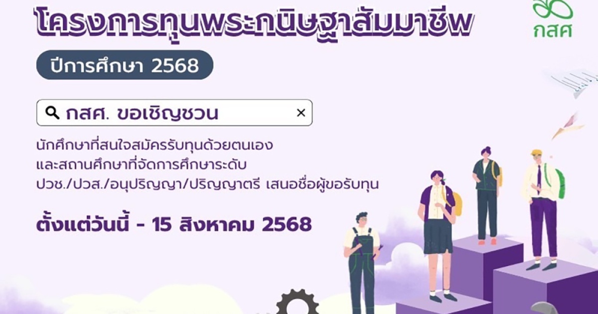 กสศ. ขอเชิญชวนสมัครรับทุนโครงการทุนพระกนิษฐาสัมมาชีพ ปีการศึกษา 2568 ตั้งแต่วันนี้ ถึง 15 ส.ค. 2568