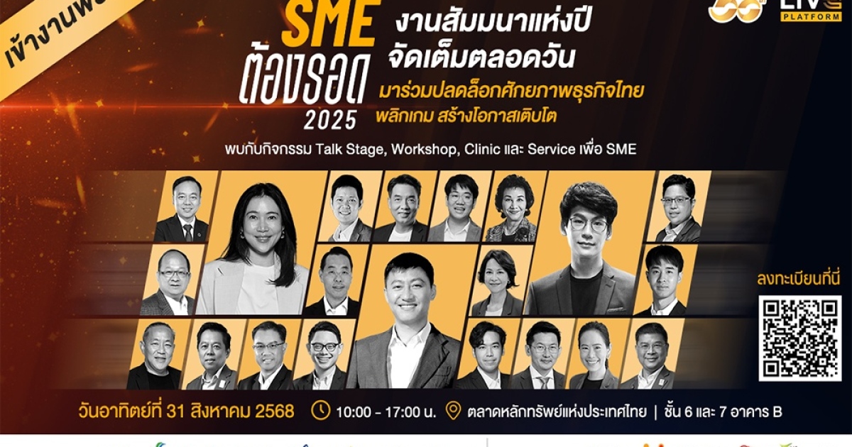 LiVE Platform โดยบริษัท ไลฟ์ฟินคอร์ป จำกัด ภายใต้กลุ่มตลาดหลักทรัพย์แห่งประเทศไทย ชวนผู้ประกอบการ SMEs และ Startups รวมถึงผู้บริหารองค์กร และทีมงานสายพัฒนาองค์กร ร่วมงานสัมมนา SME แห่งปี “SME ต้องรอด 2025” มาปลดล็อคศักยภาพธุรกิจไทย พลิกเกม ฝ่าวิกฤตเศรษฐกิจไปด้วยกัน พบกับการรวมตัวของผู้เชี่ยวชาญแถวหน้าของประเทศที่จะมาเปิดทุกมุมมอง พร้อมเสิร์ฟกลยุทธ์ที่ “ใช้ได้จริง” ให้คุณเข้าใจทุกเทรนด์ ทั้งเศรษฐกิจ เทคโนโลยี การเงิน การเข้าถึงแหล่งทุน และการบริหารคน จัดเต็มตลอดวัน ใน 4 Stages