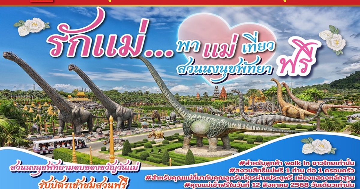 สำหรับคุณแม่ที่มากับคุณลูก รับบัตรผ่านประตูเข้าชมสวนนงนุชพัทยา ฟรี!(แม่ฟรี1ท่านต่อ1ครอบครัว) เฉพาะวันอังคารที่ 12 สิงหาคม 2568 เท่านั้น ไม่จำกัดจำนวน ผู้เข้าใช้สิทธิ์ต้องแสดงหลักฐานยืนยันความเป็นแม่-ลูก เช่น บัตรประชาชน หรือสำเนาทะเบียนบ้านที่มีนามสกุลเดียวกัน เฉพาะลูกค้าวอล์คอินที่เป็นชาวไทยเท่านั้น เงื่อนไขอื่นเป็นไปตามที่สวนนงนุชพัทยากำหนด