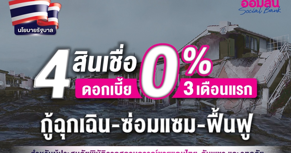 ธนาคารออมสินยังคงยึดมั่นบทบาท “ธนาคารเพื่อสังคม” ที่อยู่เคียงข้างคนไทยในทุกสถานการณ์ และพร้อมเป็นพลังทางการเงินในการฟื้นฟูชีวิตความเป็นอยู่และขับเคลื่อนเศรษฐกิจของประเทศ ที่ผ่านมาธนาคารได้ส่งความช่วยเหลืออย่างเต็มกำลัง ทั้งการจัดส่งถุงยังชีพ “ออมสินห่วงใย” ไปยังพื้นที่ประสบภัยพิบัติทั้ง 2 เหตุการณ์แล้วกว่า 2,500 ชุด เพื่อบรรเทาความเดือดร้อนเฉพาะหน้า สนับสนุนงบประมาณจัดซื้อสิ่งของจำเป็น รวมกว่า 2.5 ล้านบาท พร้อมออกมาตรการเร่งด่วน “พักชำระหนี้อัตโนมัติ 3 เดือน โดยไม่คิดดอกเบี้ย และธนาคารเป็นผู้รับภาระดอกเบี้ยแทนลูกหนี้ทั้งหมดในช่วงเวลาดังกล่าว” เพื่อลดภาระทางการเงินให้ลูกหนี้ได้ฟื้นตัว ศึกษารายละเอียดเพิ่มเติมเกี่ยวกับสินเชื่อได้ที่เว็บไซต์ www.gsb.or.th