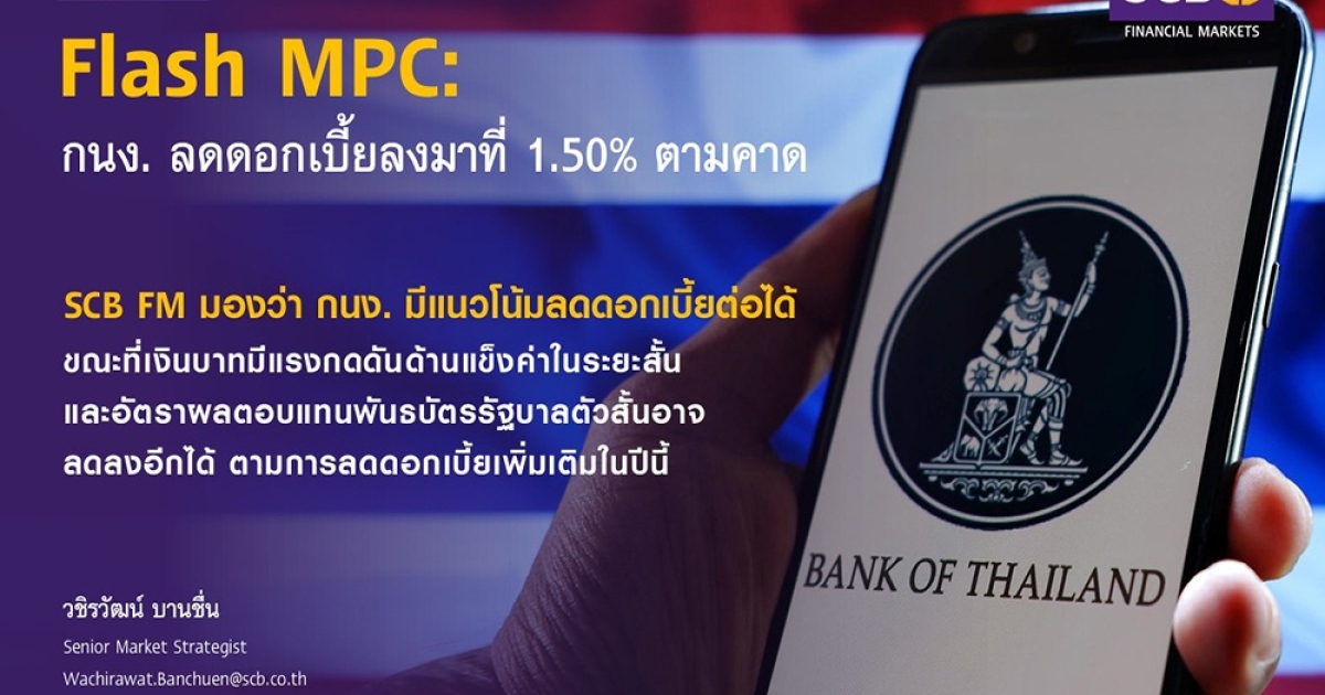 นายวชิรวัฒน์ บานชื่น นักกลยุทธ์ตลาดการเงินอาวุโส สายงานตลาดการเงิน ธนาคารไทยพาณิชย์ จำกัด (มหาชน) เปิดเผยว่าคณะกรรมการนโยบายการเงิน (กนง.) มีมติเอกฉันท์ให้ลดดอกเบี้ยนโยบายลง 25 bps มาอยู่ที่ 1.50% ตามที่ตลาดคาด เพื่อให้ภาวะการเงินผ่อนคลายลงอีก เอื้อต่อการปรับตัวของภาคธุรกิจ และช่วยบรรเทาภาระของกลุ่มเปราะบาง โดยเฉพาะธุรกิจ SMEs และครัวเรือนรายได้น้อย