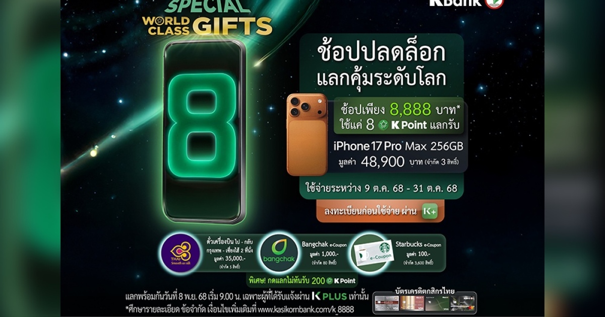 บัตรเครดิตกสิกรไทย จัดเต็มให้ลูกค้ารับความคุ้มครั้งใหม่กับแคมเปญ Special WORLD CLASS GIFTS: ช้อปปลดล็อก แลกคุ้มระดับโลก* จัดโปรโมชั่นพิเศษ เพียงลงทะเบียนก่อนใช้จ่ายผ่าน K PLUS และใช้จ่ายสะสมผ่านบัตรเครดิตกสิกรไทย ครบ 8,888 บาท* ในหมวดสินค้าที่ร่วมรายการ ระหว่างวันที่ 9 ตุลาคม 2568 – 31 ตุลาคม 2568 รับสิทธิ์ใช้ K Point แค่ 8 คะแนน แลกรับสินค้าแบรนด์ดัง