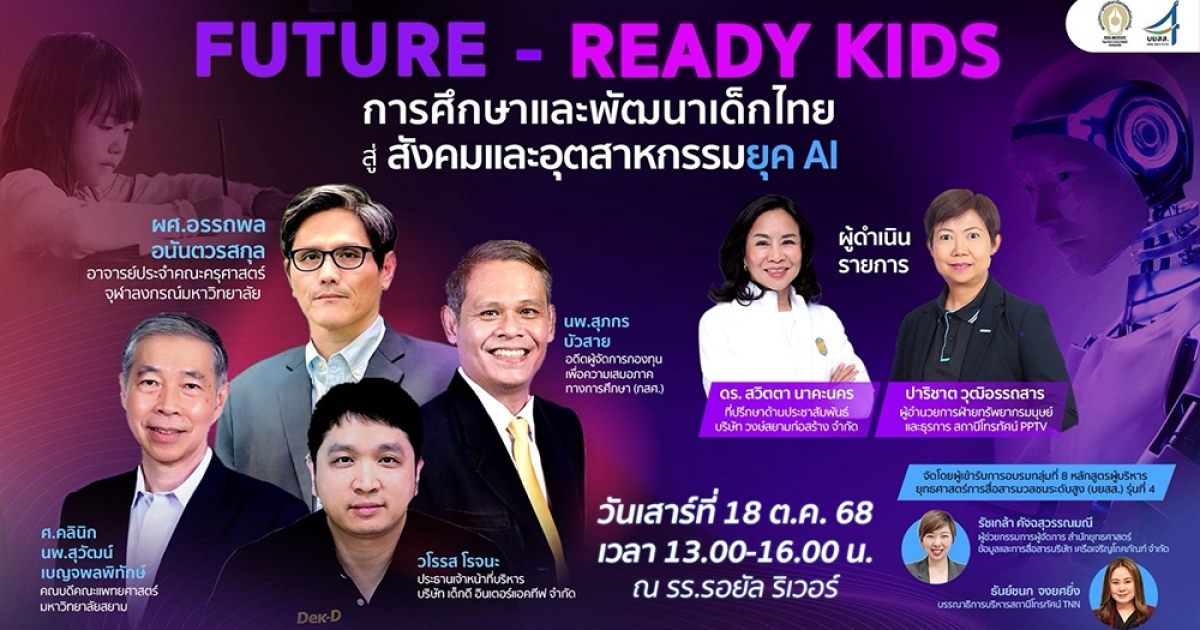 นายประสงค์ เลิศรัตนวิสุทธิ์ ผู้อำนวยการบริหารสถาบันอิศรา นายชวรงค์ ลิมป์ปัทมปาณี ผู้อำนวยการหลักสูตร นางสาวอมรรัตน์ มหิทธิรุกข์ ผู้จัดการหลักสูตร และ ศ.คลินิก นพ.สุวัฒน์ เบญจพลพิทักษ์ ประธานกลุ่มที่ 8 และผู้เข้าอบรมหลักสูตรผู้บริหารยุทธศาสตร์การสื่อสารมวลชนระดับสูง (บยสส.) รุ่นที่ 4 กลุ่มที่ 8 ให้การต้อนรับ นพ.สุภกร บัวสาย อดีตผู้จัดการกองทุนเพื่อความเสมอภาคทางการศึกษา (กสศ.) และ ผศ.อรรถพล อนันตวรสกุล อาจารย์ประจำคณะครุศาสตร์ จุฬาลงกรณ์มหาวิทยาลัย ในโอกาสเสวนาสัมมนากลุ่มย่อย กลุ่มที่ 8 หัวข้อ“Future-Ready Kids: การศึกษาและพัฒนาเด็กไทย สู่สังคมและอุตสาหกรรมยุค AI” เมื่อวันเสาร์ที่ 18 ตุลาคม 2568 ที่ผ่านมา ณ ห้องบงกชรัตน์ บี ชั้น 2 โรงแรมรอยัล ริเวอร์ บางพลัด กรุงเทพฯ
