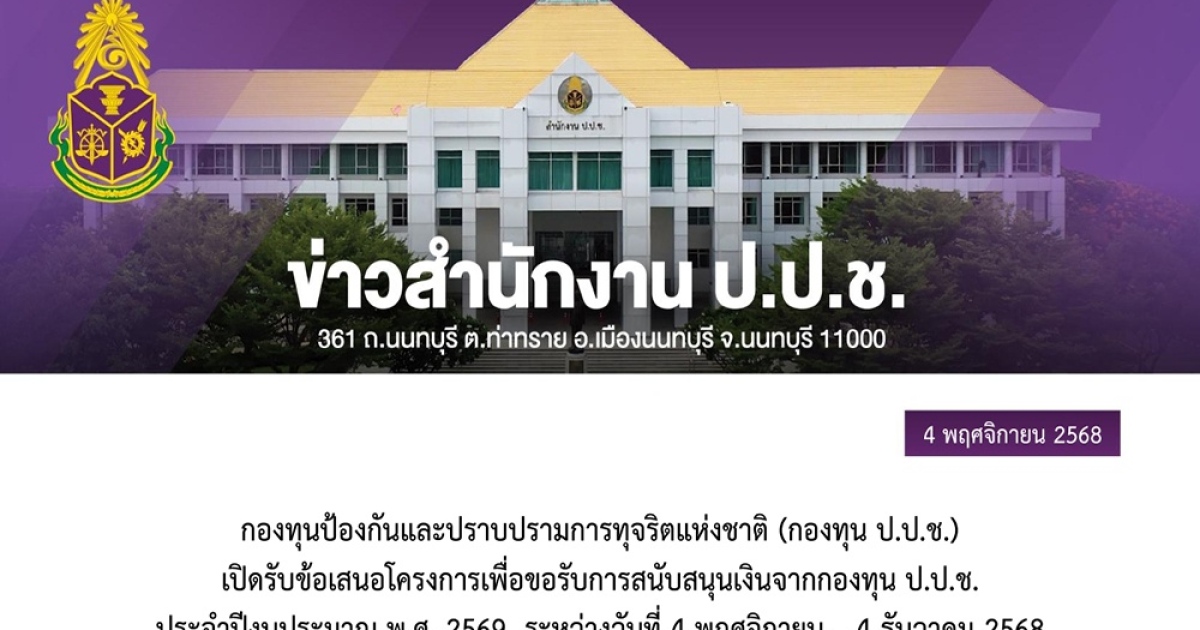 กองทุนป้องกันและปราบปรามการทุจริตแห่งชาติ (กองทุน ป.ป.ช.) เปิดรับข้อเสนอโครงการเพื่อขอรับการสนับสนุนเงินจากกองทุน ป.ป.ช. ประจำปีงบประมาณ พ.ศ. 2569 ระหว่างวันที่ 4 พฤศจิกายน – 4 ธันวาคม 2568