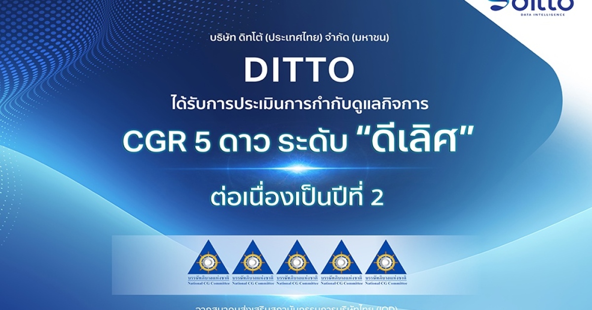 DITTO คว้า CGR ระดับ ดีเลิศ 5 ดาว 2 ปีซ้อน สะท้อนถึงศักยภาพการดำเนินธุรกิจที่ดี มีธรรมาภิบาล โปร่งใส เติบโตอย่างยั่งยืน