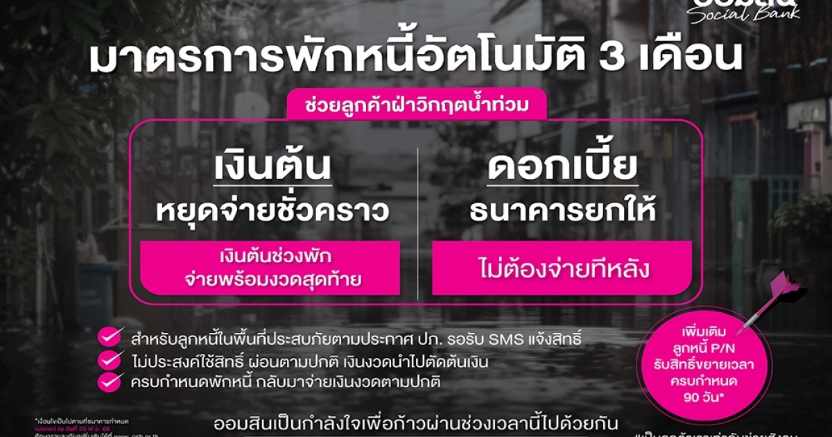 ออมสิน ช่วยลูกหนี้ฝ่าวิกฤตน้ำท่วม ให้พักหนี้อัตโนมัติ 3 เดือนสำหรับพื้นที่ตามประกาศ ปภ. เงินต้นช่วงพักให้ยกไปจ่ายงวดสุดท้าย ส่วนดอกเบี้ยไม่ต้องจ่าย เบื้องต้นช่วยได้กว่า 100,000 ราย