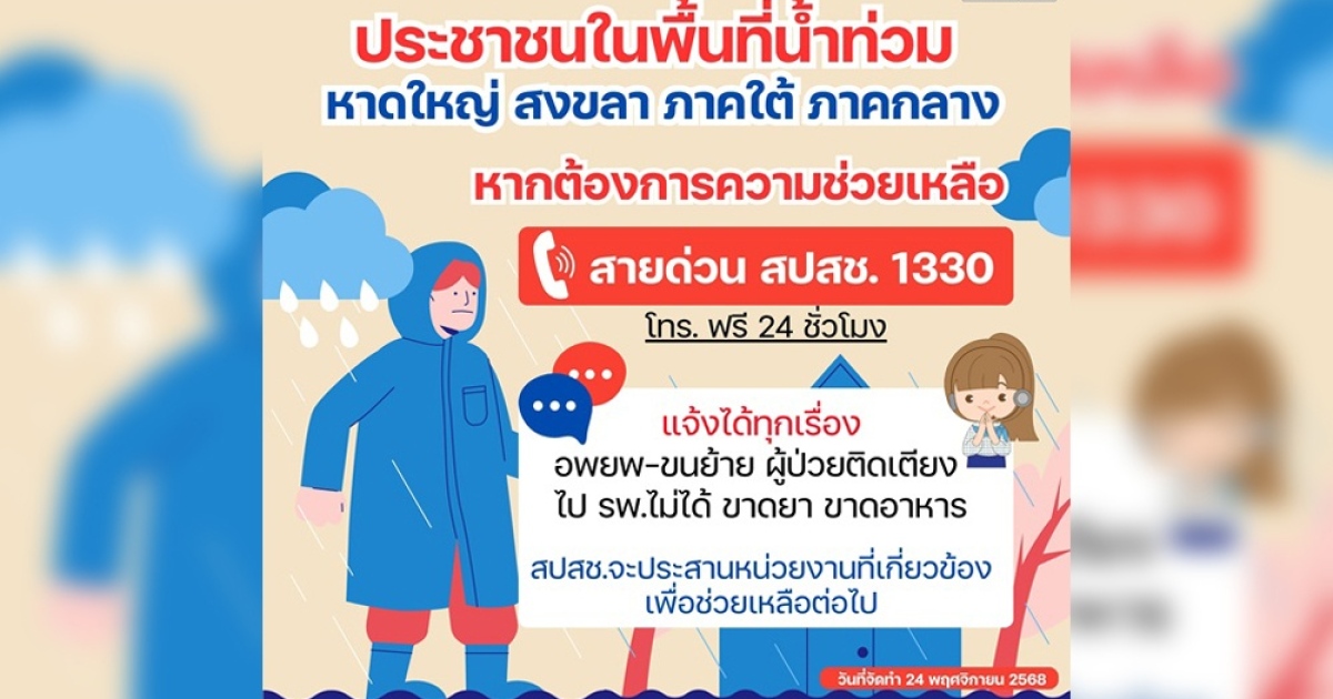 จากสถานการณ์น้ำท่วมในหลายพื้นที่ของประเทศ ทั้งภาคกลาง ภาคใต้ โดยเฉพาะจังหวัดสงขลาและอำเภอหาดใหญ่ ที่มีประชาชนได้รับผลกระทบเป็นจำนวนมาก การเดินทาง การเข้าถึงบริการสาธารณสุข และการดูแลผู้ป่วยกลุ่มเปราะบางเป็นไปอย่างยากลำบาก สำนักงานหลักประกันสุขภาพแห่งชาติ (สปสช.) จึงได้ปรับการทำงานของสายด่วน สปสช. 1330 เพื่อช่วยเหลือประชาชนที่ได้รับผลกระทบจากสถานการณ์น้ำท่วมมากขึ้น รับแจ้งทุกเรื่องความเดือดร้อน และประสานหน่วยงานที่เกี่ยวข้องเข้าช่วยเหลือต่อไป