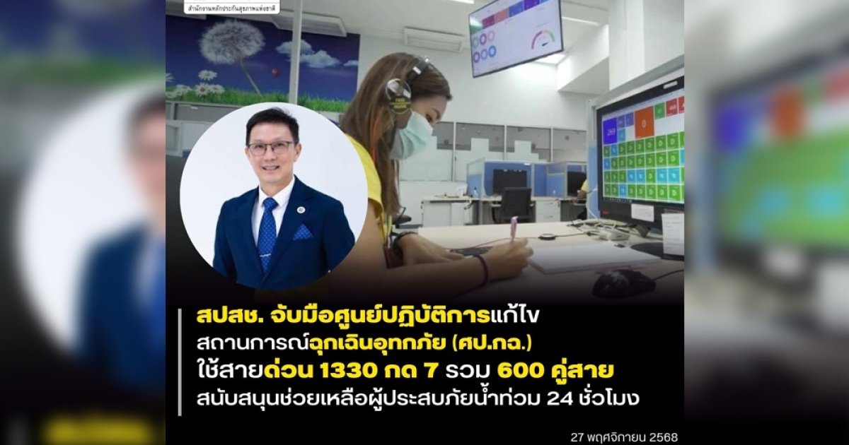 สปสช. จับมือศูนย์ปฏิบัติการแก้ไขสถานการณ์ฉุกเฉินอุทกภัย (ศป.กฉ.) ใช้สายด่วน 1330 กด 7 สนับสนุนการรับแจ้ง–ประสานช่วยเหลือผู้ประสบอุทกภัยทั่วประเทศ ตลอด 24 ชั่วโมง เสริมกำลังร่วมกับสายด่วน 1784 และ 1111 รับทุกเรื่องเกี่ยวกับน้ำท่วม ทั้งการอพยพ การเข้าถึงบริการรักษาพยาบาล และการขาดยา ระบบ 600 คู่สาย ทีมพยาบาลวิชาชีพ และเจ้าหน้าที่สื่อสารได้หลายภาษา รองรับทั้งคนไทยและชาวต่างชาติ