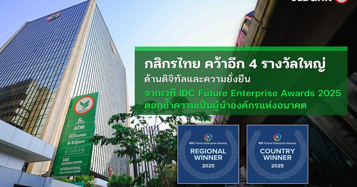 ธนาคารกสิกรไทย เป็นแบงก์ไทยแห่งเดียวที่กวาด 4 รางวัลใหญ่ ระดับประเทศและระดับภูมิภาคจากเวที IDC Future Enterprise Awards 2025 ที่จัดขึ้นที่ประเทศสิงคโปร์ ได้แก่ รางวัลองค์กรยอดเยี่ยมด้านระบบนิเวศดิจิทัล ทั้งระดับประเทศไทยและระดับภูมิภาคเอเชียแปซิฟิก (2025 Thailand Winner and Asia/Pacific Regional Winner: Best in Digitally-Enabled Ecosystem) รางวัลองค์กรแห่งอนาคตยอดเยี่ยม ประจำประเทศไทย (2025 Thailand Winner: Future Enterprise of the Year) รางวัลองค์กรแห่งความยั่งยืนยอดเยี่ยม ประจำประเทศไทย (2025 Thailand Winner: Best in Sustainability) ตอกย้ำบทบาทของธนาคารกสิกรไทยในฐานะสถาบันการเงินชั้นนำระดับภูมิภาคที่ขับเคลื่อนองค์กรด้วยนวัตกรรม เทคโนโลยี และความยั่งยืนในยุคแห่งปัญญาประดิษฐ์ เพื่อส่งมอบบริการที่สะดวกรวดเร็ว และปลอดภัยให้กับลูกค้าทุกคน ทั้งนี้รางวัลดังกล่าวจัดโดย International Data Corporation (IDC) บริษัทวิจัยและให้คำปรึกษาด้านข้อมูลตลาดสำหรับตลาดเทคโนโลยีสารสนเทศ โทรคมนาคม และเทคโนโลยีเพื่อผู้บริโภค ที่ได้รับความเชื่อถือสูงสุดแห่งหนึ่งของโลก